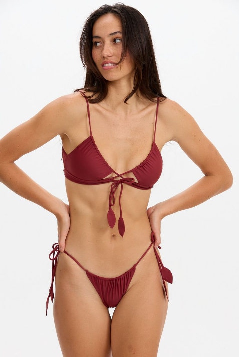 A super skimpy, single slide-able strap with tie sides and leaf detail